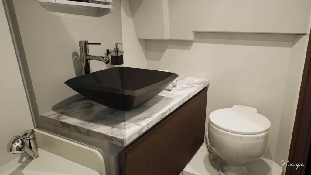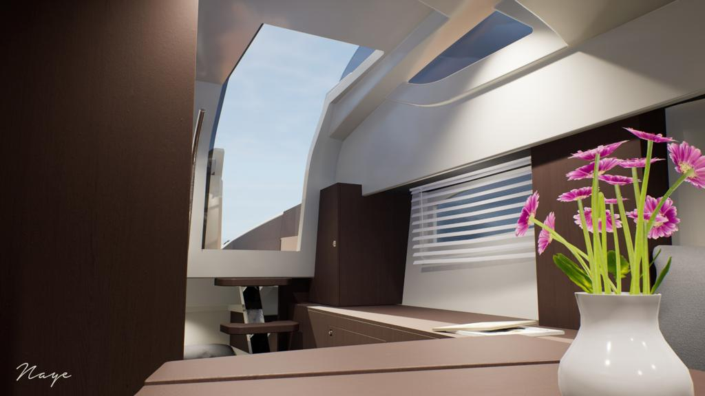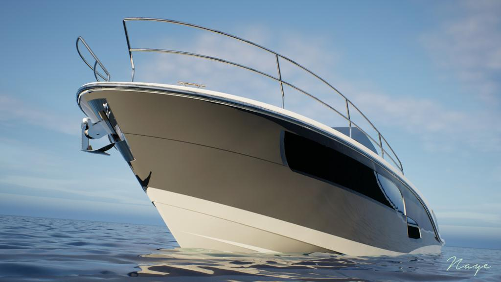 Uno scafo molto performante, sia in termini di velocità che di comfort di navigazione. Offre ampi spazi esterni per la crociera diurna, con un grande pozzetto. La sezione di poppa presenta due divano a L con schienali moderni e un tavolo che si trasforma in prendisole. La prua offre un ampio prendisole con schienali a chaise longue. La console offre spazio per la più moderna e completa strumentazione di bordo.